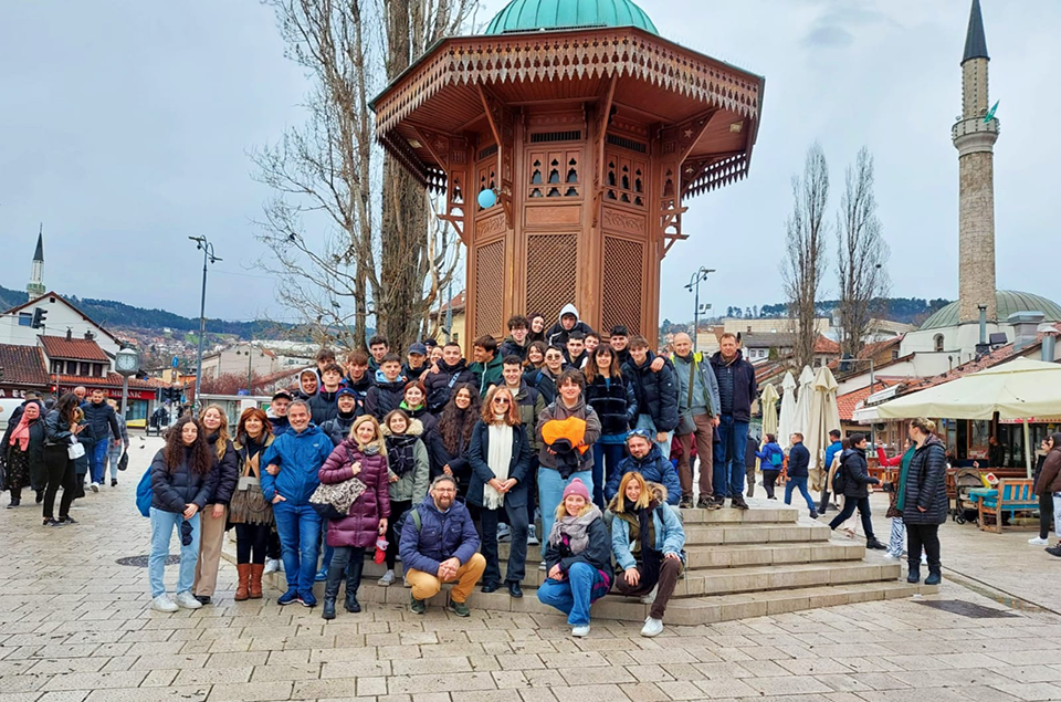 e quelle passate, che riportano ancora sul loro cemento le tracce degli spari che hanno subito ben trent’anni prima. Abbiamo soggiornato qui tre notti e è stata un’esperienza che ha lasciato una grande impronta su di noi. Nonostante un mancato incontro con una testimone di guerra dovuto ad una sfortunata serie di eventi, i volontari hanno organizzato un viaggio straordinario, capace di far vivere a pieno il clima del luogo. Così mentre loro ci portavano nei luoghi di interesse principale, ci spiegavano cosa fosse successo nella biblioteca nazionale o in una determinata strada, ci accompagnavano all’interno di associazioni che tentano di risollevare il paese o a parlare con l’imam della moschea più antica di Sarajevo, noi andavamo a vivere il più possibile la città. E grazie anche ad una loro spinta ci siamo veramente riusciti. Abbiamo passeggiato tra le luci notturne del centro, abbiamo fatto compere nei mercatini della Baščaršija, abbiamo assaggiato il caffè turco, abbiamo ascoltato i canti delle preghiere del muezzin e il suono del cannone che segnava la fine del digiuno del ramadan, abbiamo accarezzato i gatti di strada e ci siamo riempiti di dolcetti al limone. Infine l’ultimo giorno, un po’ stanchi e infreddoliti, abbiamo ripreso il viaggio e tra la neve siamo arrivati nella nostra ultima tappa, Srebrenica. Qui l’atmosfera è devastante. La sua storia ed il suo dolore si respirano, entrano nei polmoni e non ne escono più, si aggrappano con le unghie e con i denti e lasciano da soli con la propria coscienza e i propri pensieri. Non si può uscire da quella città senza conservarne un segno. La visita alla fabbrica dismessa, sede dell’ONU durante la guerra, e alla mostra permanente oggi allestita, con i video delle violenze della guerra e gli oggetti ritrovati chissà dove e appartenuti a chissà chi, prendono allo stomaco il visitatore e lo invitano ad un’eventuale riflessione, ma non è così per il memoriale. Il memoriale annienta completamente lo spettatore. Il numero di morti, quasi 9000, spaventa e può creare un’illusione di preparazione, ma non si è mai pronti per quella distesa infinita di lapidi bianche che lasciano lo spazio per futuri ritrovamenti e quell’elenco di nomi e cognomi tutti uguali, delle stesse famiglie, che sembra non finire più. Non si è mai pronti. Vederlo così desolato, ricoperto di neve, nel grigiore delle nuvole, con l’innocente gioia di due cani randagi che hanno deciso di rincorrersi e giocare proprio su quel simbolo di dolore è un ricordo di cui non ci libereremo facilmente. Nel frattempo si era fatta ora di pranzo e siamo stati trascinati a mangiare in una casa del posto. Così poi, con la pancia più piena e i cuori più leggeri abbiamo incontrato Irvin Mujcic. Egli si è presentato a noi come una persona che ha vissuto la guerra, ma lo ha fatto con dei modi, dei toni e un’ironia spiazzanti; inoltre non ci ha parlato solo di questo, ha voluto andare avanti. Ci ha parlato del mondo di oggi e di come noi dovremmo averne cura, ma purtroppo stiamo fallendo miseramente. Ci ha chiesto qualcosa su di noi e ha detto qualcosa su di sé e sulla terra in cui vive, con cui è connesso. Esattamente come il suo paese, nonostante il dolore negli occhi e nella voce, vuole costruire qualcosa di più e si impegna per farlo, con una passione e una determinazione che affascina e che sprona chiunque a provare ad essere sempre una versione migliore di se stessi. Con il poco tempo rimasto a disposizione, siamo arrivati a Tuzla, dove abbiamo trascorso l’ultima sera, vissuta con insoliti festeggiamenti di compleanno e con la testimonianza, tanto inaspettata quanto apprezzata, voluta dal destino, del nostro autista, che dopo averci accompagnato fedelmente per quattro giorni, si è sentito abbastanza sicuro da raccontarci la sua storia di profugo, con un po’ di soggezione ma tantissima emozione. Così è arrivato anche il giorno del ritorno a casa, in cui la neonata nostalgia ha dato voce a saluti e dediche commoventi e speciali.