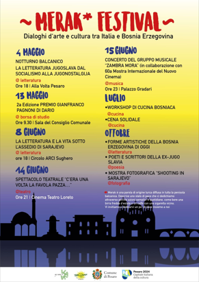 In seguito al successo della prima edizione del Merak Festival nel 2024, l’associazione Lutva propone anche per il 2025, una serie di iniziative culturali gratuite volte a far conoscere la ricchezza di relazioni fra le due sponde dell’Adriatico e l’incontro fra i rispettivi patrimoni letterari, musicali e artistici. I tragici eventi che hanno segnato trent’anni fa i territori a noi vicini della ex Jugoslavia e in particolare della Bosnia-Erzegovina, hanno creato un forte legame, tuttora vivo, con la città di Pesaro e con i suoi cittadini che negli anni hanno promosso iniziative culturali e di solidarietà. Questo forte legame è testimoniato pienamente dal gemellaggio che dal 2018 unisce Pesaro e la città di Sarajevo Novi Grad.